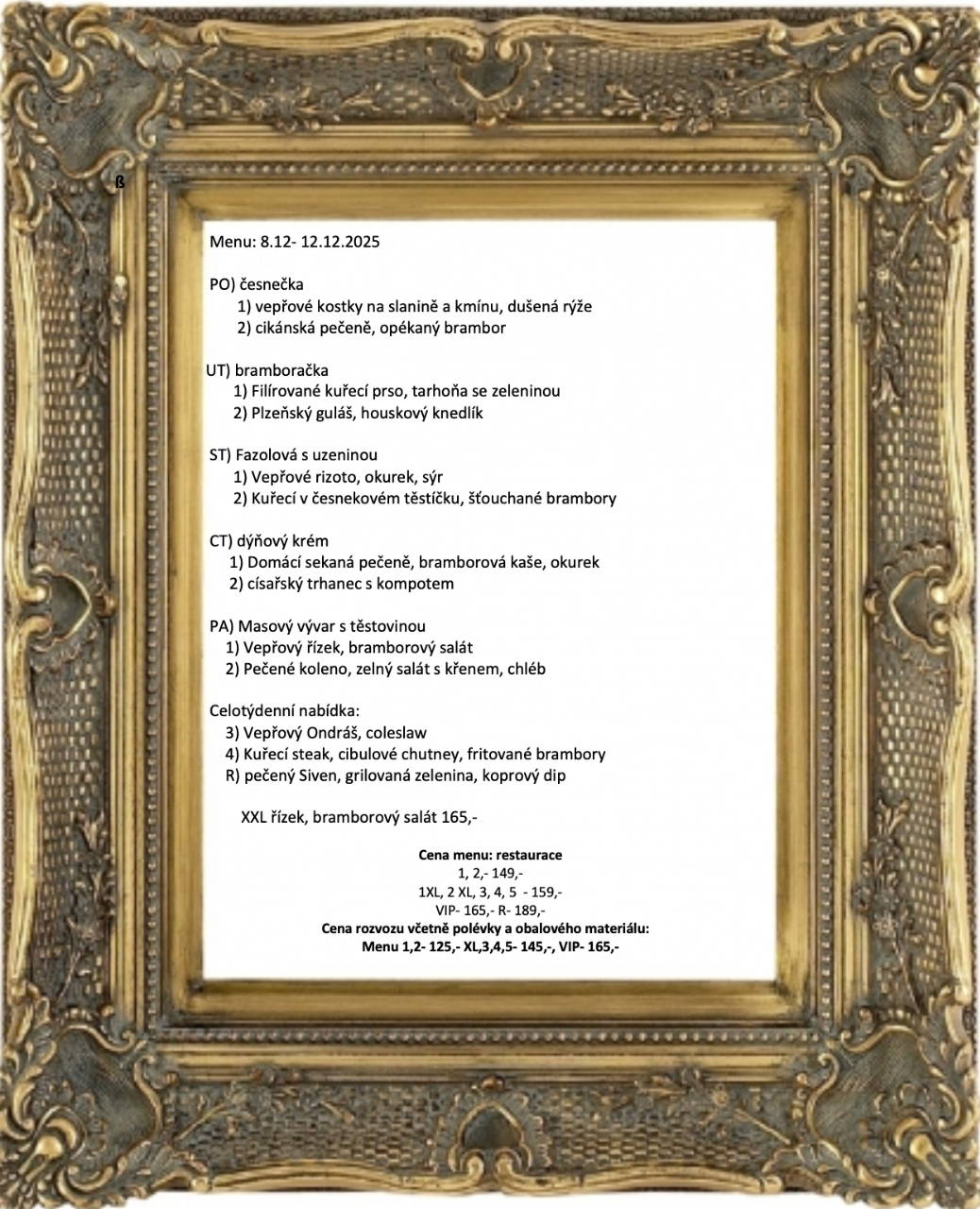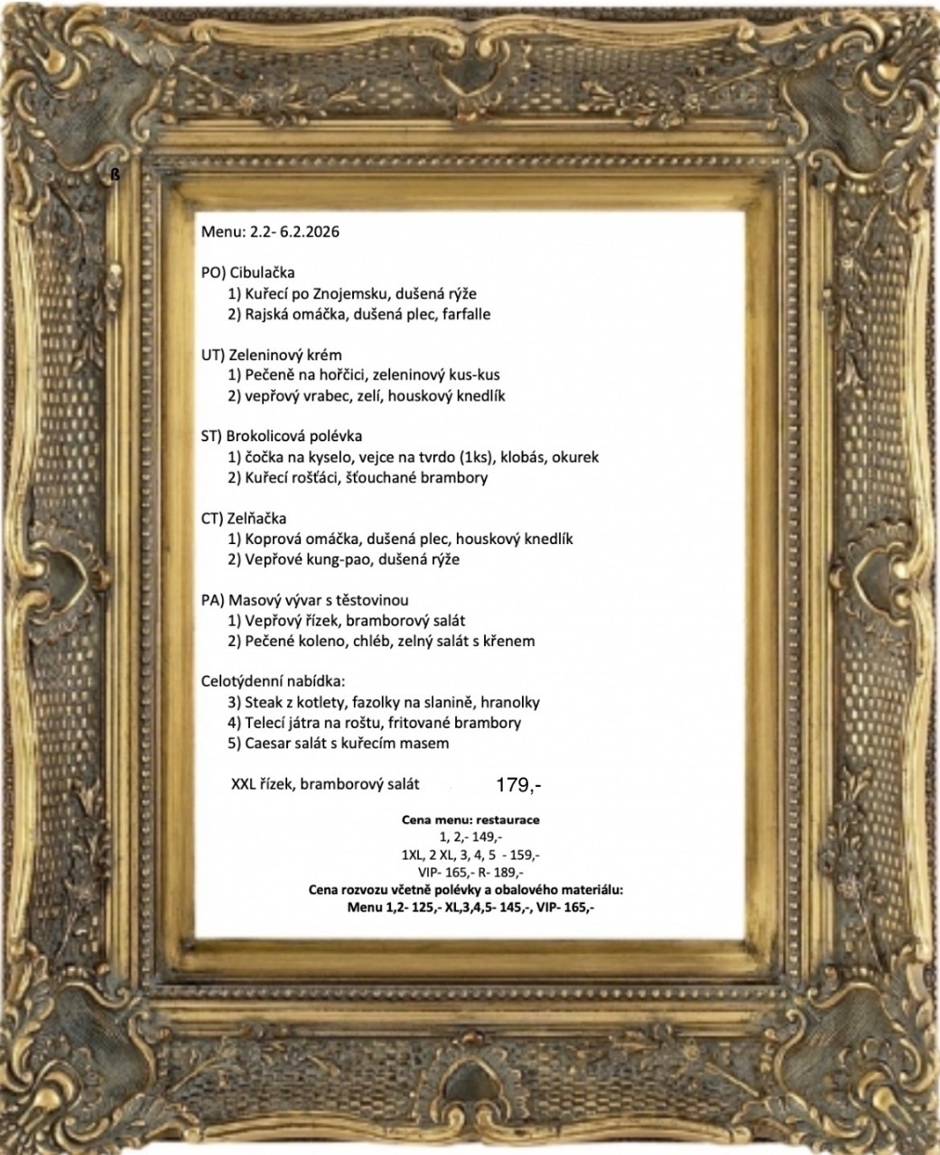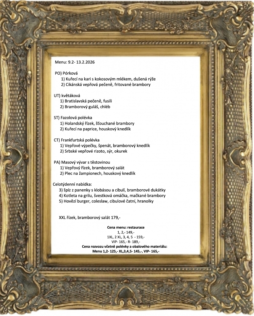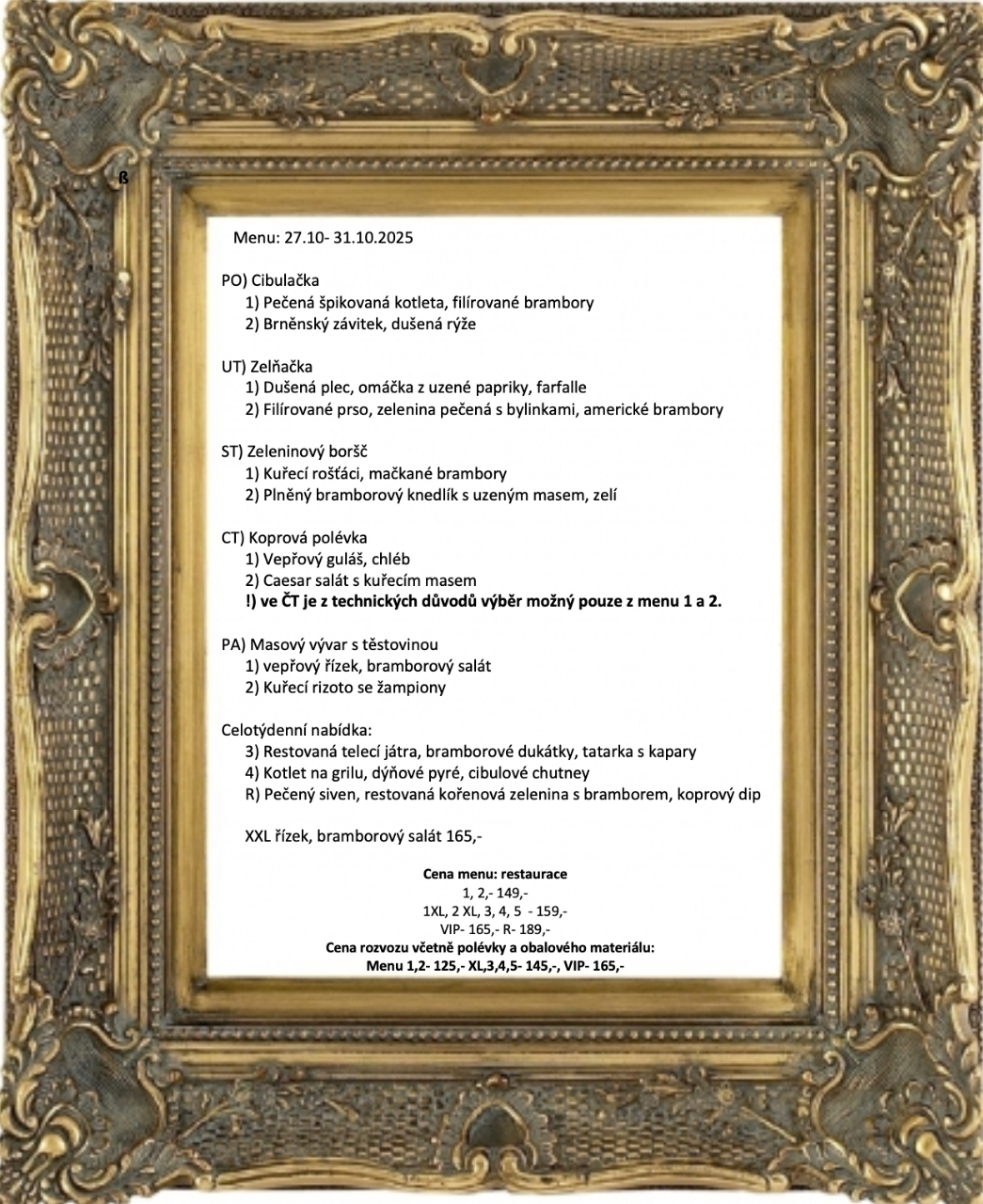 Menu na rozvoz lze objednat tentýž den do 9.30 hodin formou sms na tel.: 608525621
